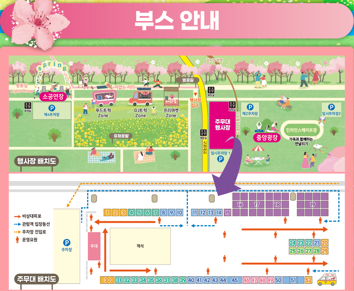 이 축제의 가장 큰 특징은 단순 벚꽃 감상이 아닌 ‘참여형 체험 + 공연 중심 구조’입니다. 특히 중앙광장 중심으로 패밀리존과 체험존이 구성되어 있어 하루 종일 머물러도 지루하지 않은 구조를 가지고 있습니다.
